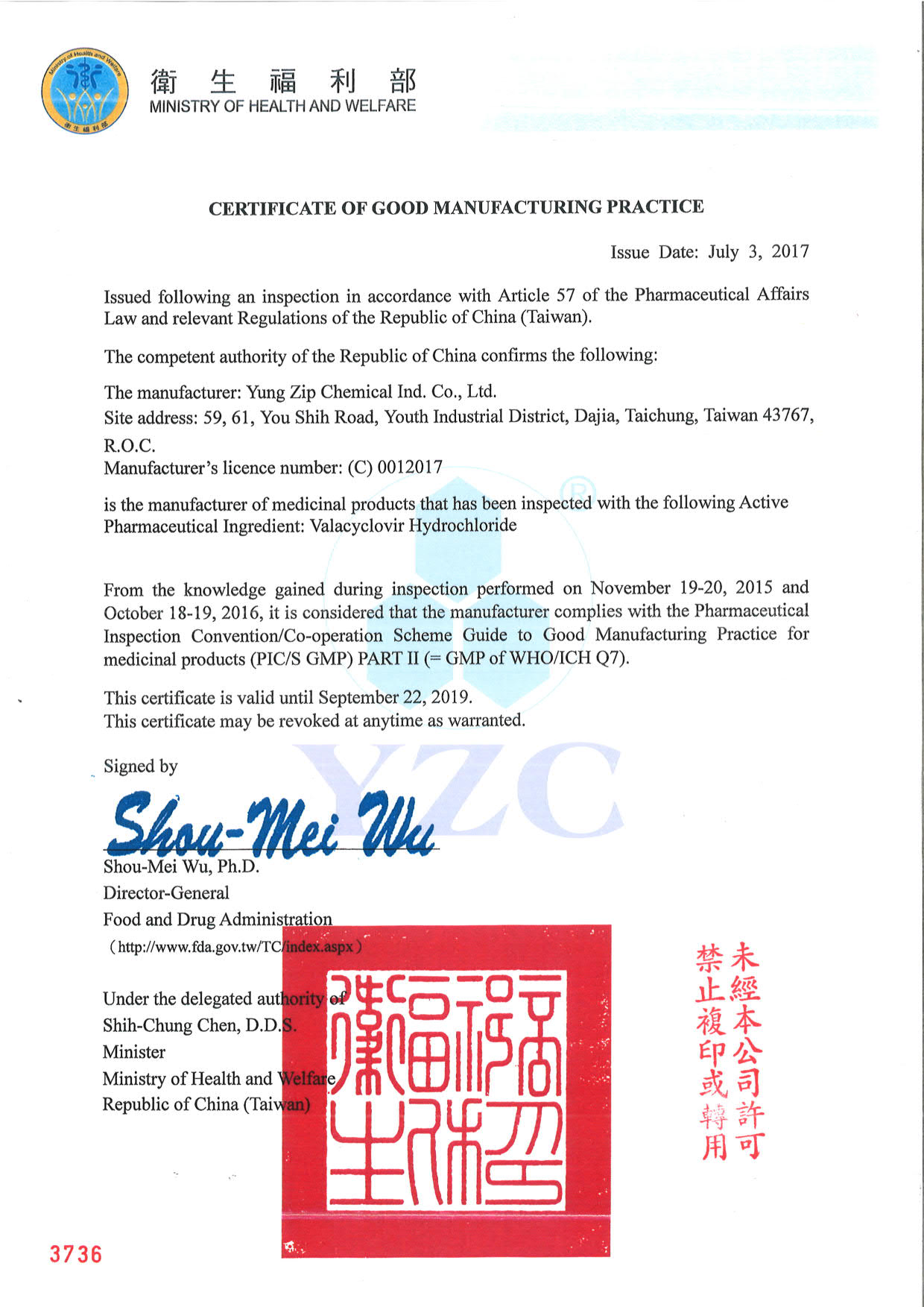 2017 03 七月 通過TFDA PIC/S GMP認證 本公司於2017年7月3日取得PIC/S GMP認證,產品為Valacyclovir Hydrochloride(anhydrous)。 回到列表